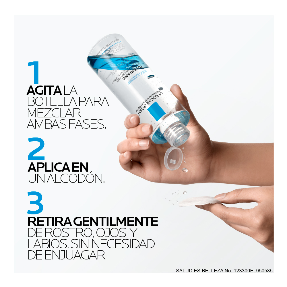 Agite la botella hasta que se mezclen las 2 fases. Aplicar el producto en una bola de algodón y luego limpiar el rostro, los ojos y los labios para eliminar el maquillaje y las impurezas. No requiere aclarado. Sin acabado graso.