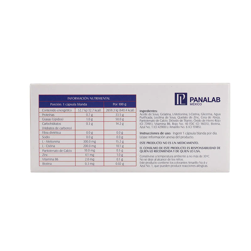 Ingredientes: L-Metionina, L-Cistina, Pantotenato de Calcio, Zinc, Vitamina B6 y Biotina.