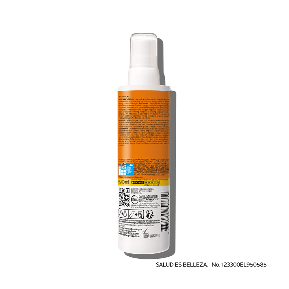 Máxima Protección solar anti rayos UVA/ UVB protege la piel de los daños causados por los rayos infrarrojos y la luz visible. La NUEVA fórmula contiene la tecnología INTELIMER patentada que hace que el producto sea resistente al agua, sudor y arena. Adicional no arde en los ojos y tiene una textura fluida y ligera, fácil de aplicar en spray.