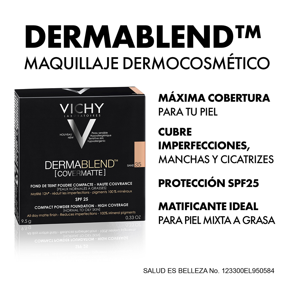 Polvo compacto de alta cobertura para un terminado mate. Las propiedades matificantes de este polvo compacto son ideales para mantener un cutis mate durante todo el día. Textura en polvo para facilitar su aplicación y retoque. La tecnología de Dermablend Covermatte es capaz de fundirse con la piel, extensible en finas películas, logrando que el tono se unifique globalmente. Su textura en polvo, otorga un resultado homogéneo ultra mate. Con FPS 25.