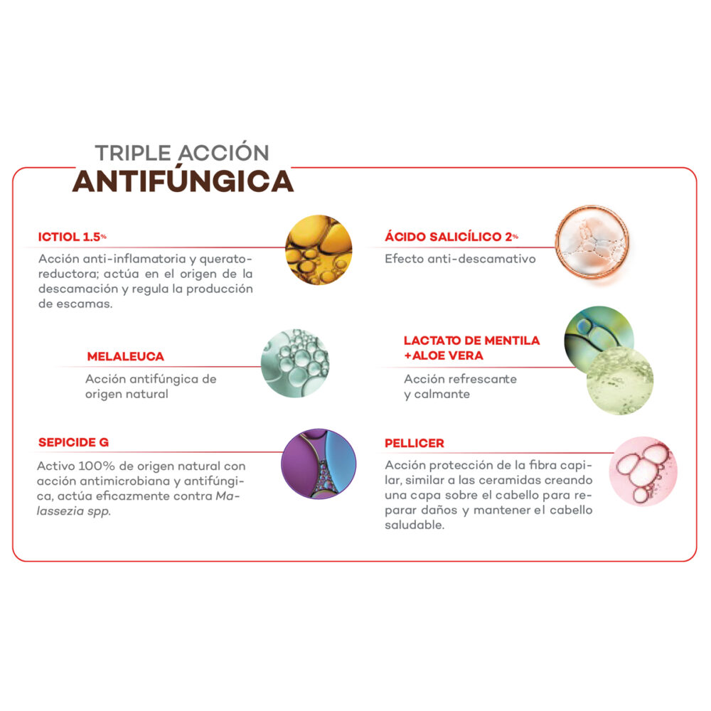 Champú dermatológico anticaspa que ofrece un tratamiento intensivo para combatir la descamación intensa, con resultados desde la 1ª aplicación.