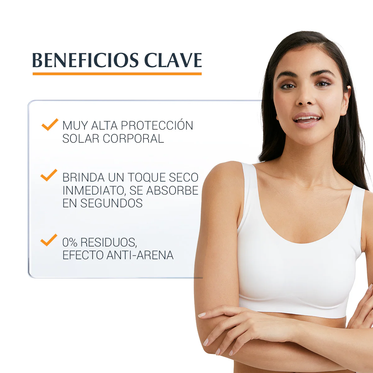Cuida tu piel de la exposición al sol con Eucerin Oil Control Toque Seco Corporal. Gracias a su textura ultra ligera y rápida absorción, deja 0 residuos pegajosos y grasos. Cuidando tu piel del daño ocasionado por el sol y otros factores ambientales. Ideal para piel normal.
