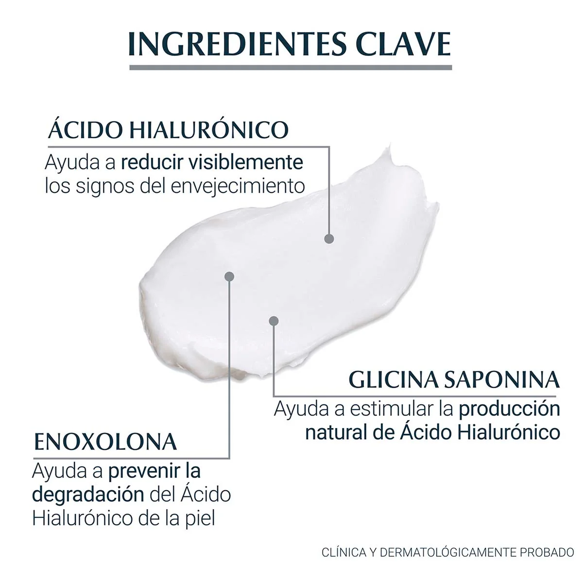 Eucerin Hyaluron-Filler crema de día piel seca contiene una combinación única de ácido hialurónico de cadena larga y de cadena corta para penetrar en las arrugas y rellenarlas desde el interior, másglicina saponinabioactiva para estimular la producción de ácido hialurónico propio y natural de la piel, mejorando el mantenimiento de los niveles de hidratación y suavizando las arrugas desde el interior.