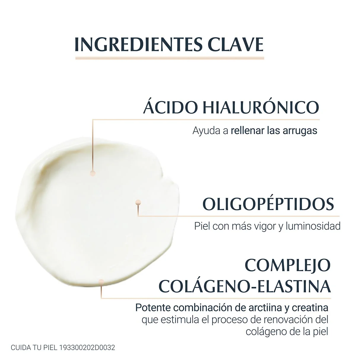 Más elasticidad: Combinación de Arctiina y Oligopéptidos que ayudan a acelerar la producción natural del colágeno en la piel. Menos arrugas: La fórmula con ácido hualurónico de cadena corta y larga , ayuda a reducir visiblemente las arrugas en la epidermis. Más luminosidad: La piel luce fresca y radiante. FPS 15 + Protección UVA que ayuda a prevenir el foto envejecimiento de la piel.