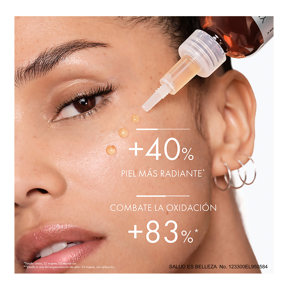 Una sinergia innovadora que combina un 15% de vitamina C pura, vitamina E, polifenoles de pino y ácido hialurónico puro en un suero de grado dermocosmético para aumentar las defensas antioxidantes para una piel más brillante y visiblemente saludable. Nuestra concentración más alta de vitamina C pura para un intenso efecto iluminador.