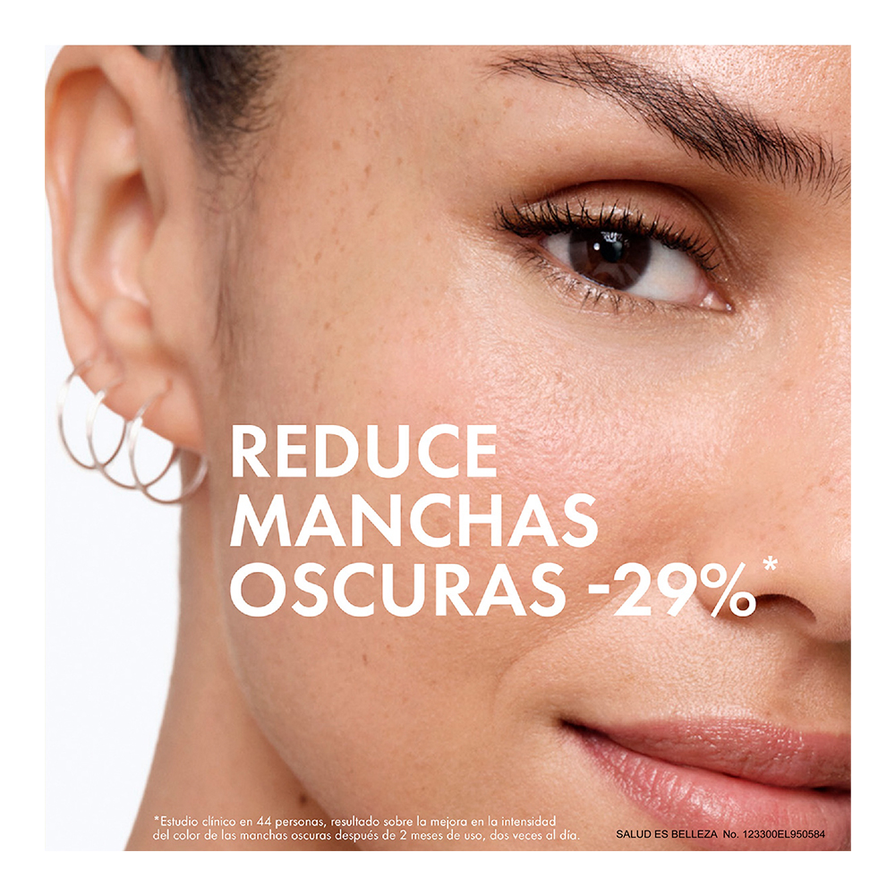 Corrige las manchas oscuras. Reduce las arrugas. Unifica el tono de la piel.