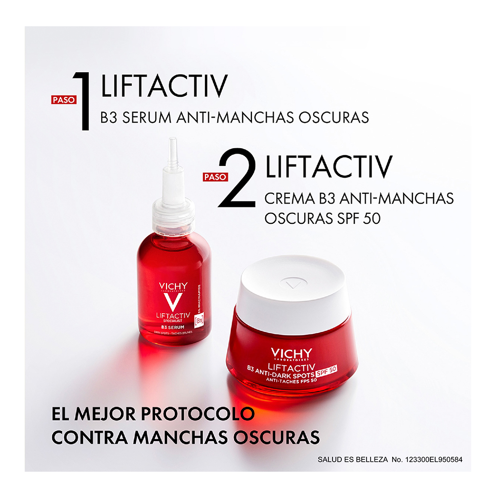 Vichy LIFTACTIV SPECIALIST SERUM B3 actúa en la piel para tratar la formación de manchas oscuras en la epidermis, mientras elimina las manchas oscuras visibles en la superficie de la piel.