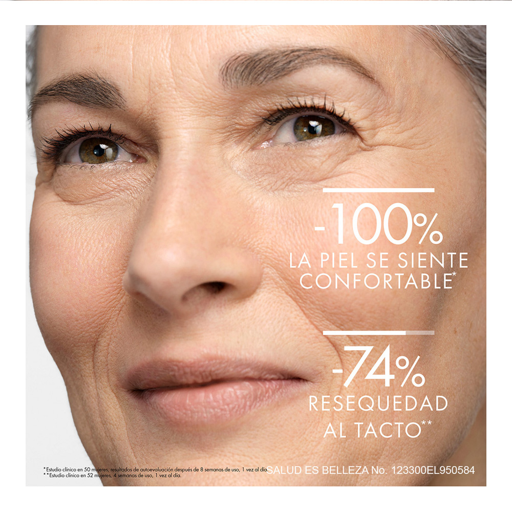 Reduce las manchas de la piel provocadas por el cambio de hormonas, mejora el tono y aporta luminosidad. Consigue una piel más firme, disminuye la profundidad de arrugas y la flacidez.