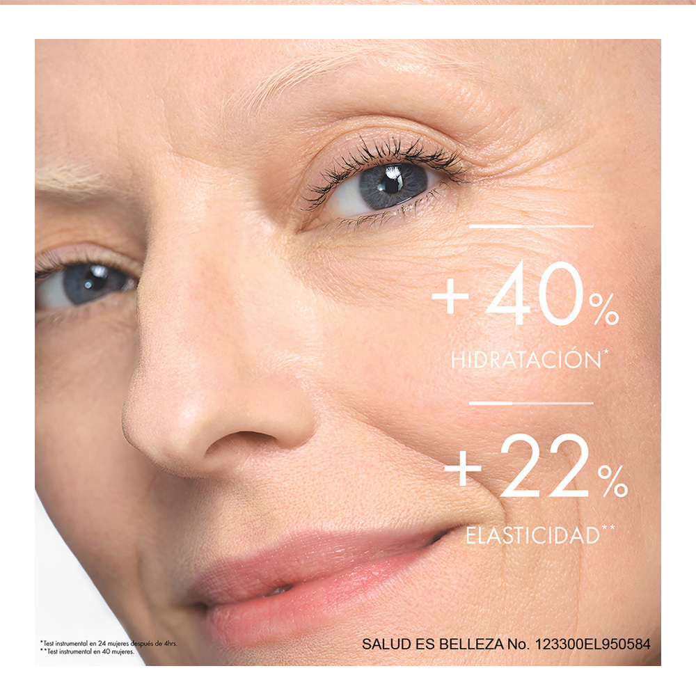 Crema hidratante ligera. Acabado uniforme e invisible. No comedogénico. Fragancia floral ligera. Aplicar por la mañana en el rostro y cuello, evitando el contorno de los ojos.