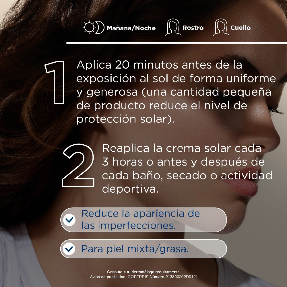 Agitese antes de usar hasta que escuches el sonido de los balines. Después de tu rutina de hidratación diaria, aplica suave y generosamente en el rostro y cuello expuestos al sol, reaplicar después de cada baño, secado o realizar actividad deportiva.