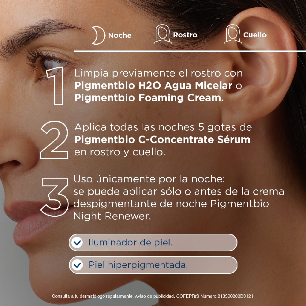 2. Corrige de manera intensa la Pigmentación: Aplica todas las noches 5 gotas de Sérum Pigmentbio C- Concentrate en rostro y cuello.