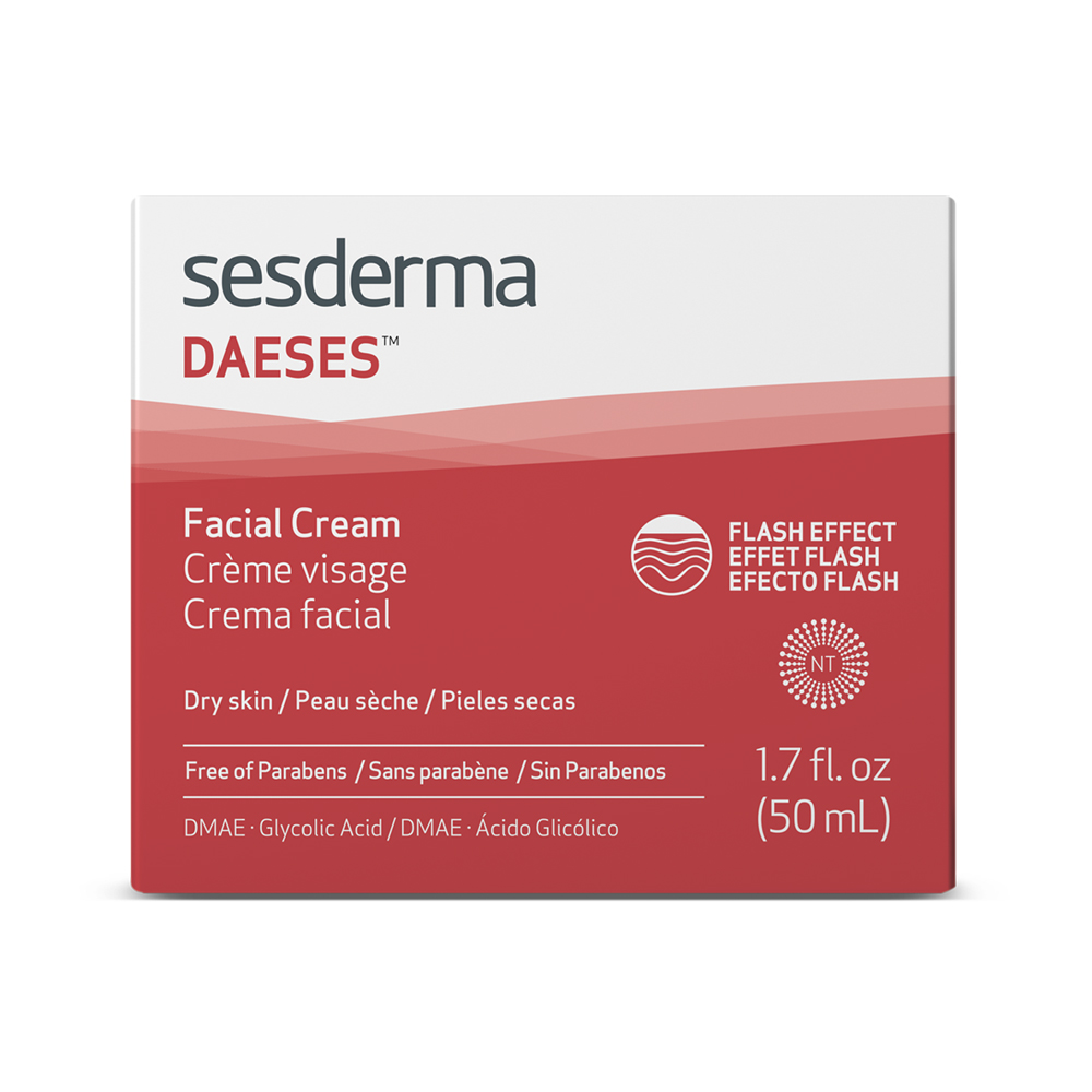 Estira, reafirma y tensa la piel. El efecto es inmediato observándose tras su aplicación una piel más firme, elástica, tersa e hidratada. Indicado para pieles secas. La línea Daeses incorpora un revolucionario componente, el DMAE (dimetilamino etanol o deanol), un nutriente natural encapsulado en liposomas que consigue que su piel se muestre más firme, elástica y tersa al instante mediante 2 mecanismos: produce un incremento del tono muscular y estimula la síntesis de colágeno, reduciendo las arrugas e incrementando la elasticidad de la piel.