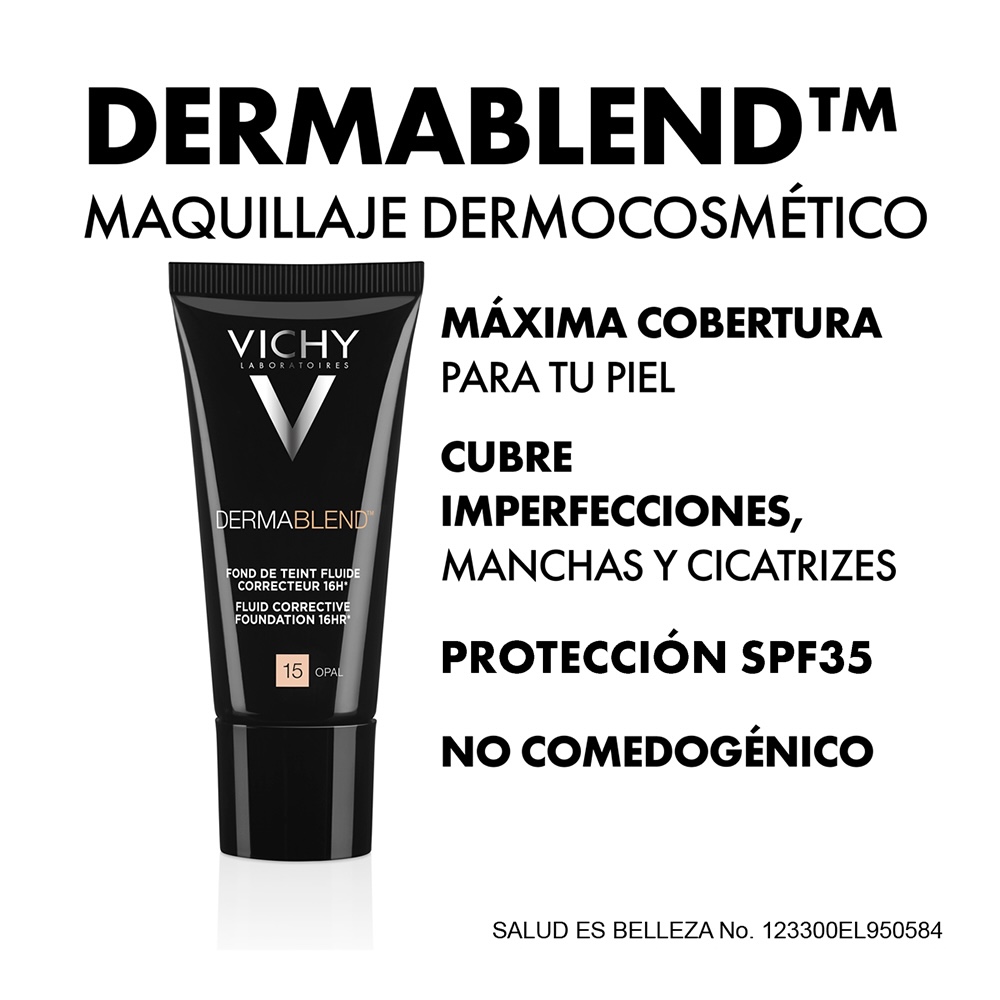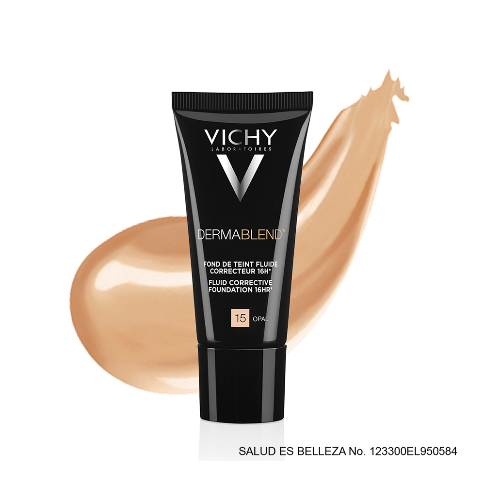 Base de alta cobertura y duración tono 15 con FPS 35 que corrige imperfecciones pigmentarias en la piel.